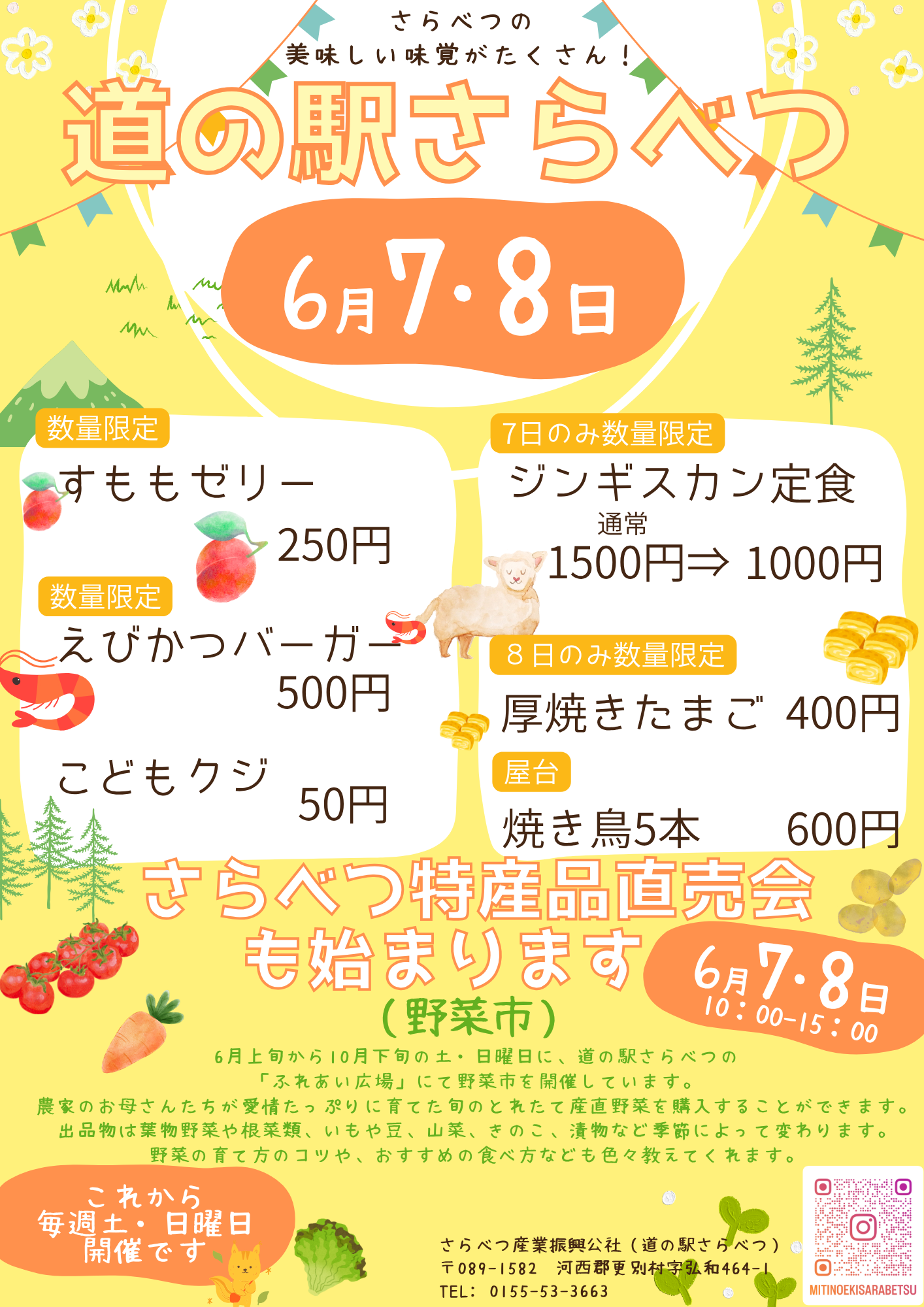 6月7・8日にさらべつ特産品直売会 (通称野菜市)が始まりますよ〜!これから毎週土・日に開催されます!